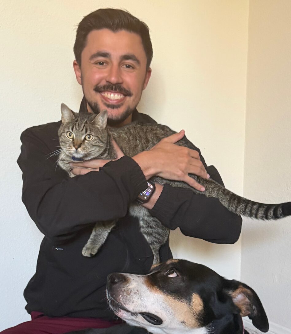 At home, he enjoys spending time with his partner and their pets—Binx, a kitten he adopted during veterinary school in Illinois, and Jojo, a rescue dog from Washington. Outside of the clinic, Dr. Moran has a lifelong love of soccer, having played since the age of six and competing on the Valencia High School team, where he helped win a regional championship. He also
